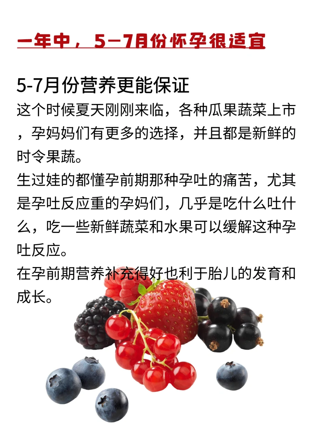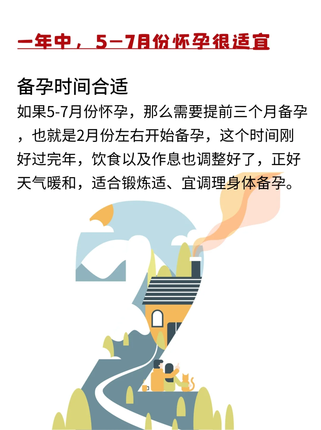 ①如果5-7月份怀孕,那么需要提前三个月备孕,也就是2月份左右开始备孕,这个时间刚好过完年,饮食以及作息也调整好了,正好天气暖和,适合锻炼适、宜调理身体备孕。