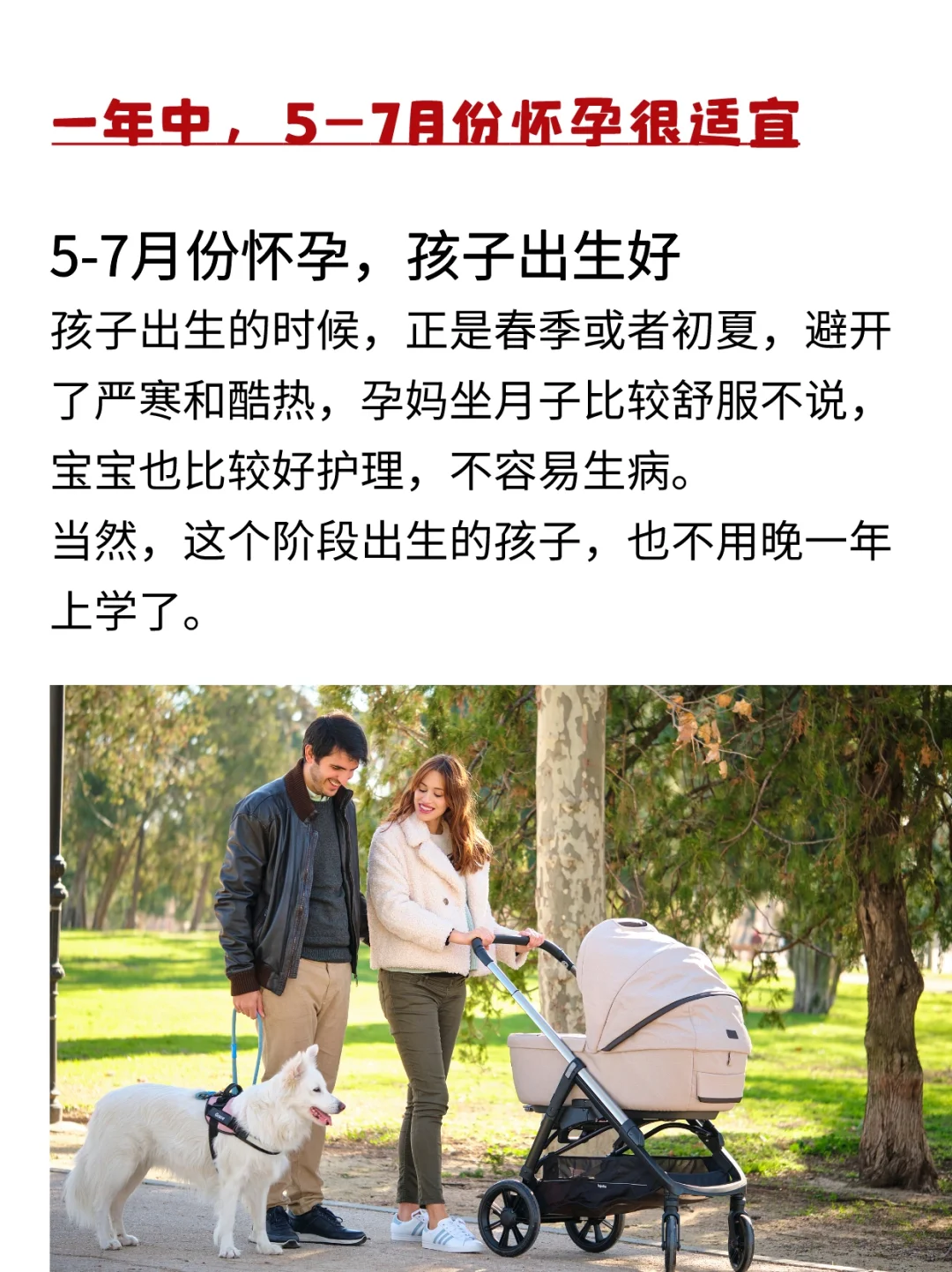 5-7月份怀孕,孕中期正好是秋季,这个时候气候不冷不热,而孕妈妈来到孕中期也是整个孕期最舒服的时候,这个时候秋高气爽,别说去户外散步了,出去旅行也是有精力的。