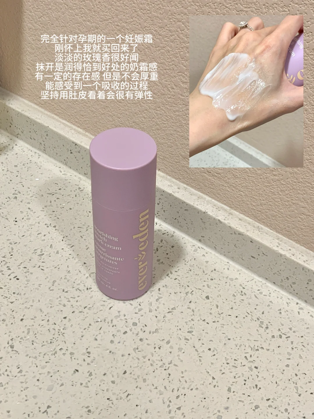 🧴evereden妊娠霜:淡淡的玫瑰香很好闻,我只会用它涂肚子因为是妊娠霜嘛,抹开是奶霜感,能感受到一个吸收的过程但是不会厚重。