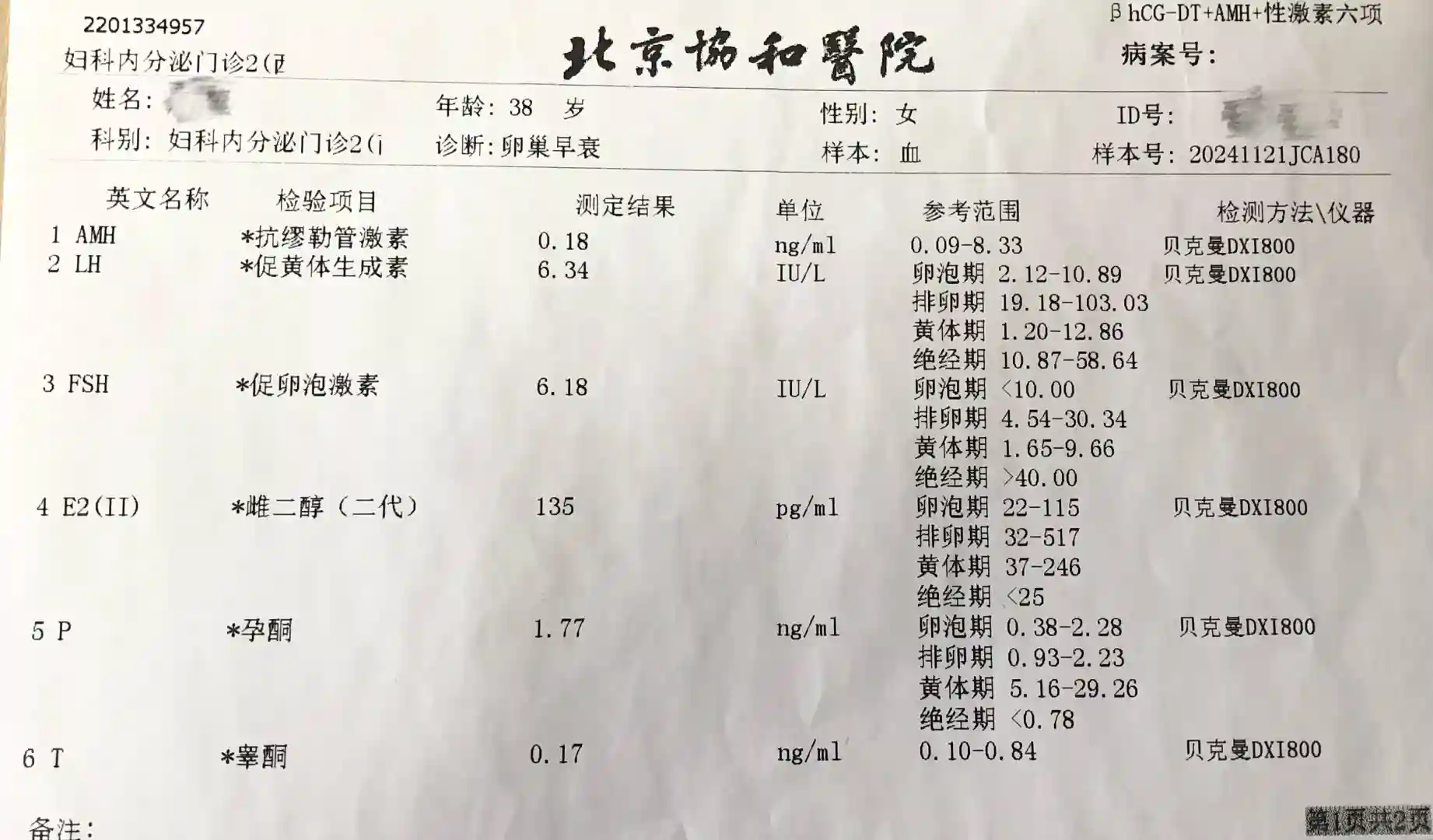 AMH0.01!!!而且子宫变得很小,各项数据都指向——我绝经了!北京世纪坛大夫说卵巢早衰不可逆,除非上天眷顾,我才有机会再怀孕。因为乳腺有结节,为了安全服用激素药物,医院又给做了乳腺B超,乳腺结节三级,咨询了乳腺科大夫,大夫说我刚38岁,还是吃上激素药吧。是啊!我刚38岁!36岁以前月经规律,不熬夜、不内耗、不乱吃东西、不吸烟不喝酒,怎么就卵巢早衰了呢?雌二醇片、戊酸雌二醇片、坤泰胶囊,这要吃到50岁啊!而且乳腺B超三个月检查一次,来确保这些激素药物不会刺激结节。卵巢退休了,月经不再来,这对于一个女人来说,打击很大,关键是不会再生育了。虽说已经生了一胎,生二胎的想法也不是很坚定,但这种被动剥夺生育权感觉,足够让一个女人自卑和难过。药一直都没吃,想去好一点的医院再看看,这期间潮热盗汗的症状已经不见,情绪暴躁的心情也逐渐平复,只是脸上和头皮上出现了很多的痘痘。11月21日挂上了北京协和医院内分泌门诊李玲大夫的号,我和她说,我不相信自己卵巢早衰,她看了我在北京世纪坛医院的检查结果也表示很惋惜,让我再查一次性激素六项和B超,给我开了钙片,因为我工作的原因,两星期后再来复诊。11月24日,居然来月经了,而且天数和月经量都正常。12月5日来找李玲大夫复诊,我告诉她我正常来月经了,她看了我新的检查结果,数值也可以,amh不是唯一指标,fsh数值也很好,她也很高兴,还宽慰我说药不用吃了,放松心情,想要二胎自然怀就行。这一天,我感觉天都蓝了。